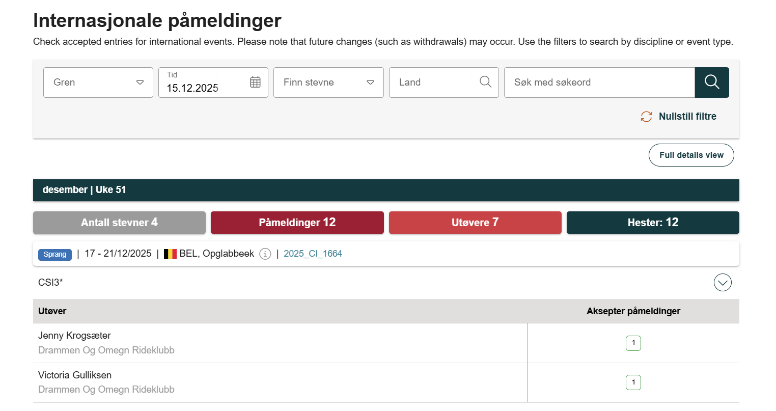 Allows checking participations of the Norwegian athletes at current and future FEI events.
